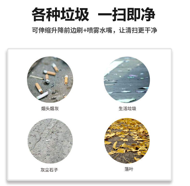 適用場所:車間廠區(qū)路面、公園廣場、高鐵站廣場、各大道路人行道輔道、體育場館、學校校園、展覽館場館、機場停機坪等等,解決灰塵、落葉、石子等垃圾清掃問題。