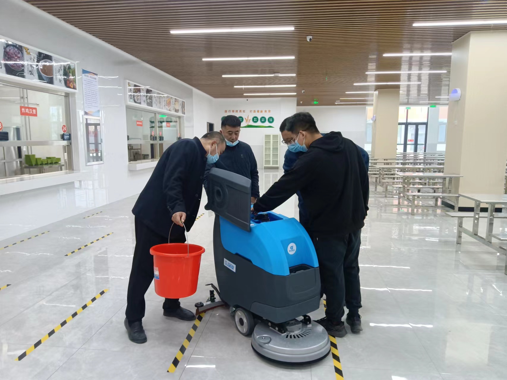 信發(fā)中學(xué)想選擇洗地機(jī)來代替人工打掃餐廳,給全校師生呈現(xiàn)整潔干凈的用餐環(huán)境。采購(gòu)人員聯(lián)系到鼎潔盛世銷售經(jīng)理,經(jīng)過銷售經(jīng)理問完面積及地面情況后,給推薦了手推式洗地機(jī):DJ530M特別適合餐廳的邊邊角角,尤其是餐廳還有桌椅,不好清洗地面,此款電動(dòng)洗地車清水箱污水箱分體式設(shè)計(jì),側(cè)翻式水箱,檢修方便,吸水膠條可以多面使用,有效節(jié)約成本。